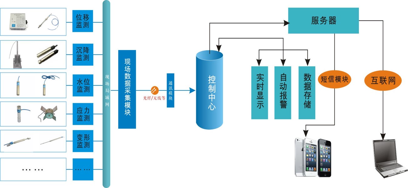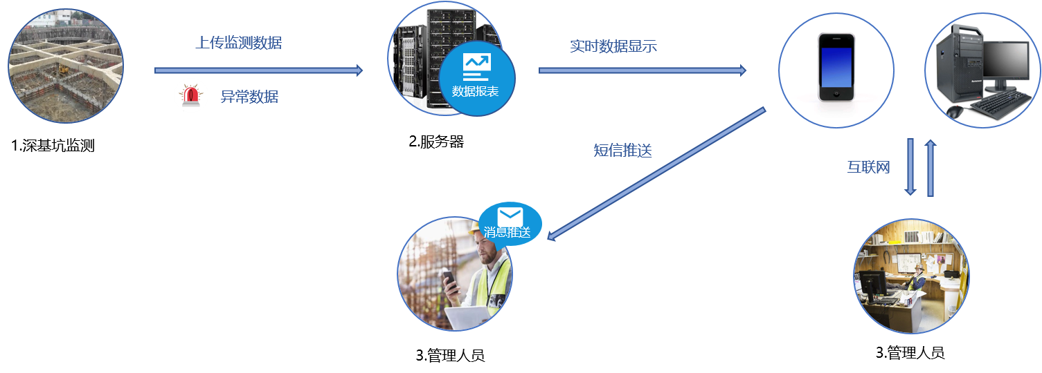 通過安裝(zhuāng)傳感器與傳輸裝置(zhì)對支護結構、地表沉降、圍護樁傾斜(xié)等實時(shí)在線監測,實時掌握建築基坑的結構變化(huà)。建立多級報警機製,發(fā)現監測數據異常時即時向(xiàng)用戶推送(sòng)報警通(tōng)知,監測結果進行(háng)實時顯示發布,並定期向用戶推送監測報表,從專(zhuān)家係統中提(tí)取處理辦法(fǎ)采取措施介入,對(duì)基坑施工期的監測數據分析與安全評估,實(shí)現結構穩定性趨勢(shì)分析。